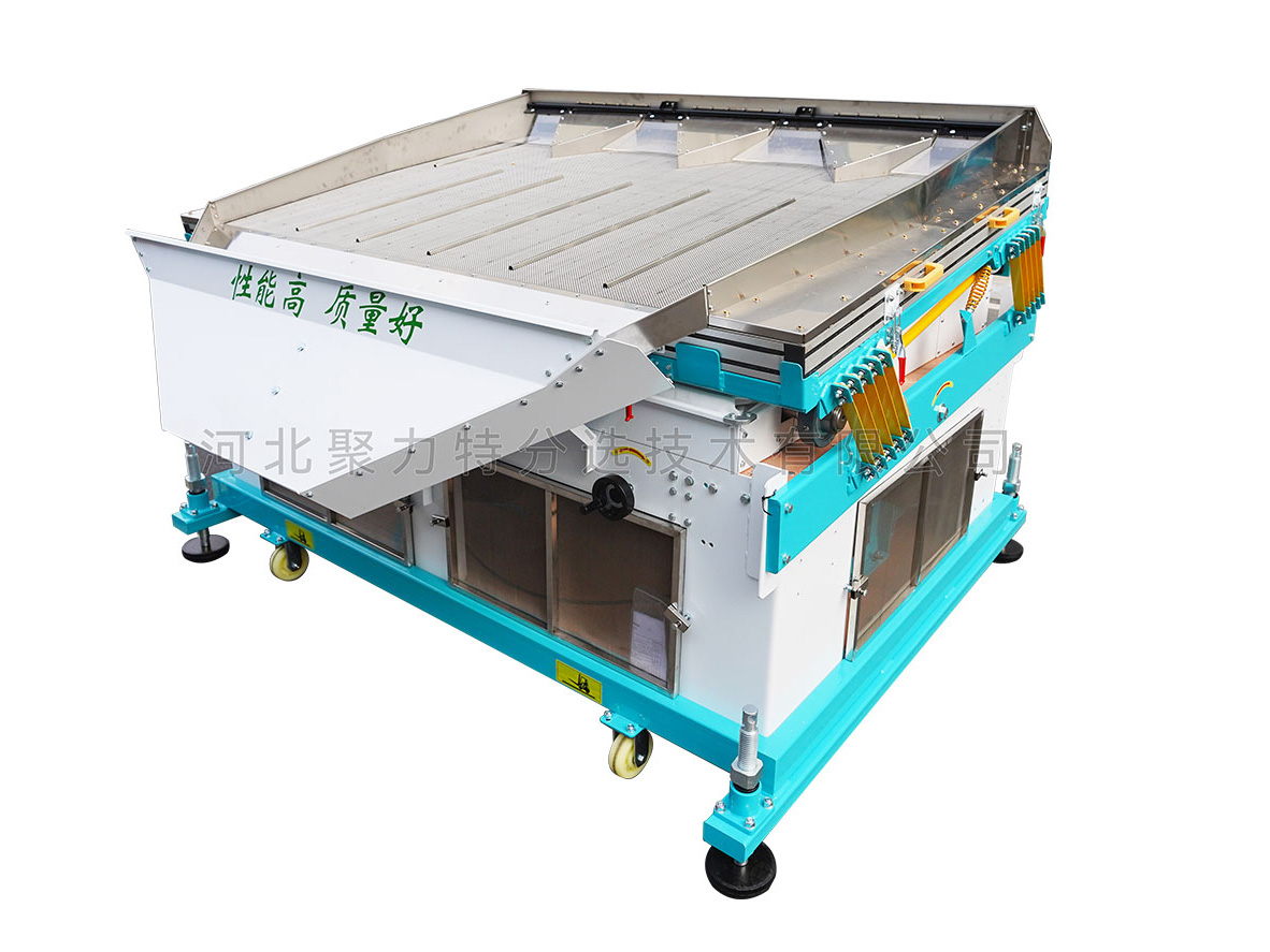 適用于單一目的物料的選別,能把物料中的并肩石(與物料粒度大小相似的砂石)等較重的雜質(zhì)有效去除。在糧食加工的工藝流程中應(yīng)安裝在篩選流程的后段工序,未經(jīng)去除大、小、輕雜質(zhì)的原料,不應(yīng)直接進(jìn)入該機(jī),以避免影響去石效果。
